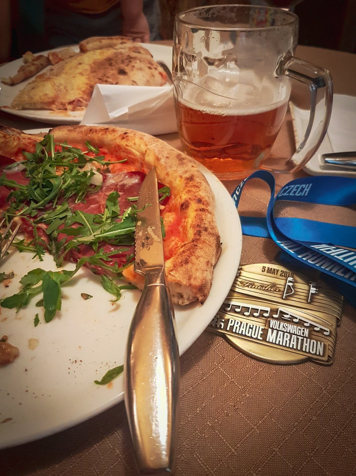 Then there is the atmosphere and sensations on the day: yes, even the butterflies as you make your way from portaloo to starting pen (they just mean you care!) and the aching legs after collecting the medal (they mean you earned it). So it’s ok to break your pace a bit in the last few yards (unless there is a PB at stake!), look around and take it all in… And don’t be in a hurry to go home either: In Prague I packed a change of clothes, towel and shower-gel in my dropped luggage, and took full advantage of the facilities in the finish area. I had a massage (it really made a difference) and then headed to the shower cubicles, got my medal engraved with my time and only then headed out to meet Demi and Philip. Having washed and changed meant we could meet in the city centre, have some lunch, take in the marathon atmosphere and make a full day of it! If this isn’t something you do, try it on your next city marathon, you won’t regret it!