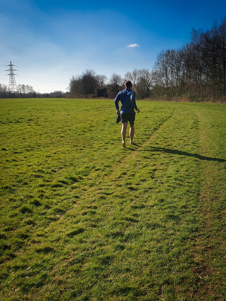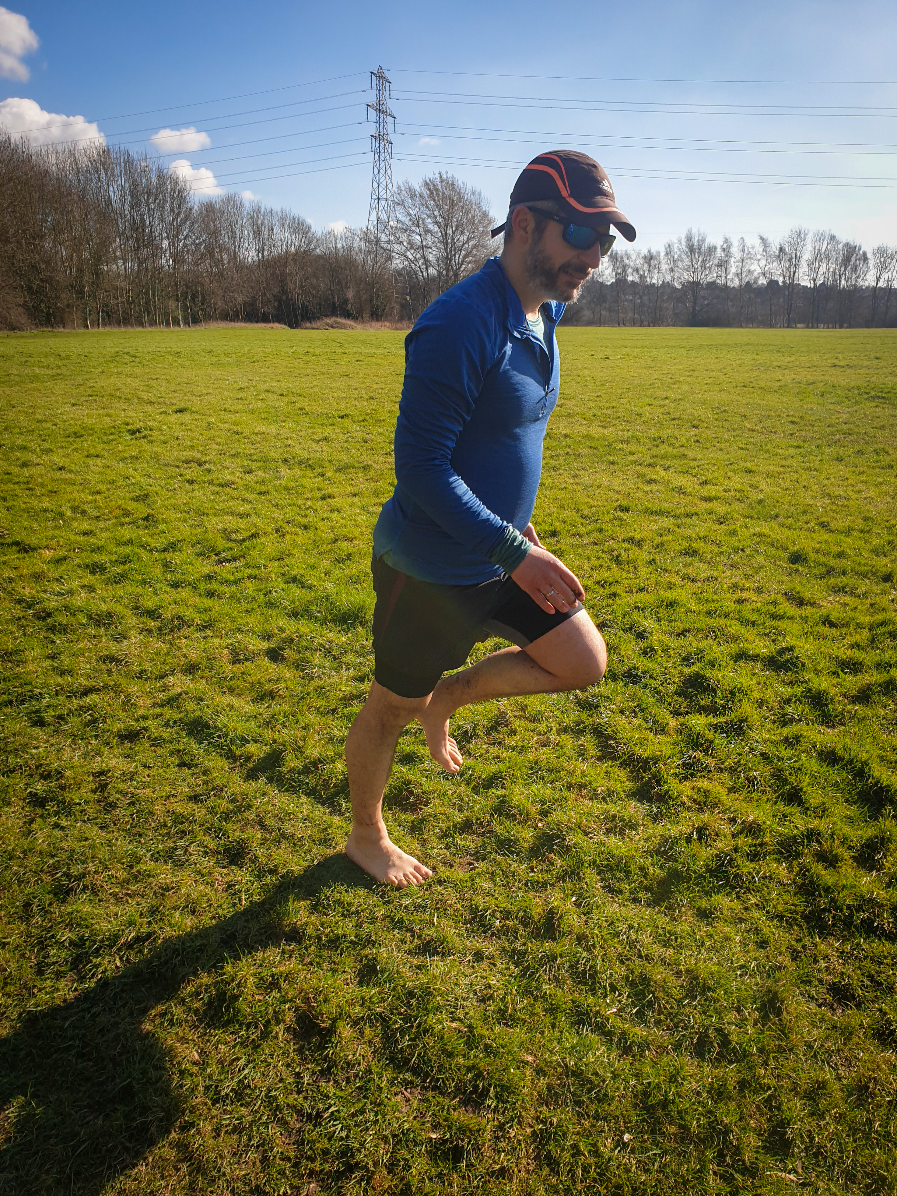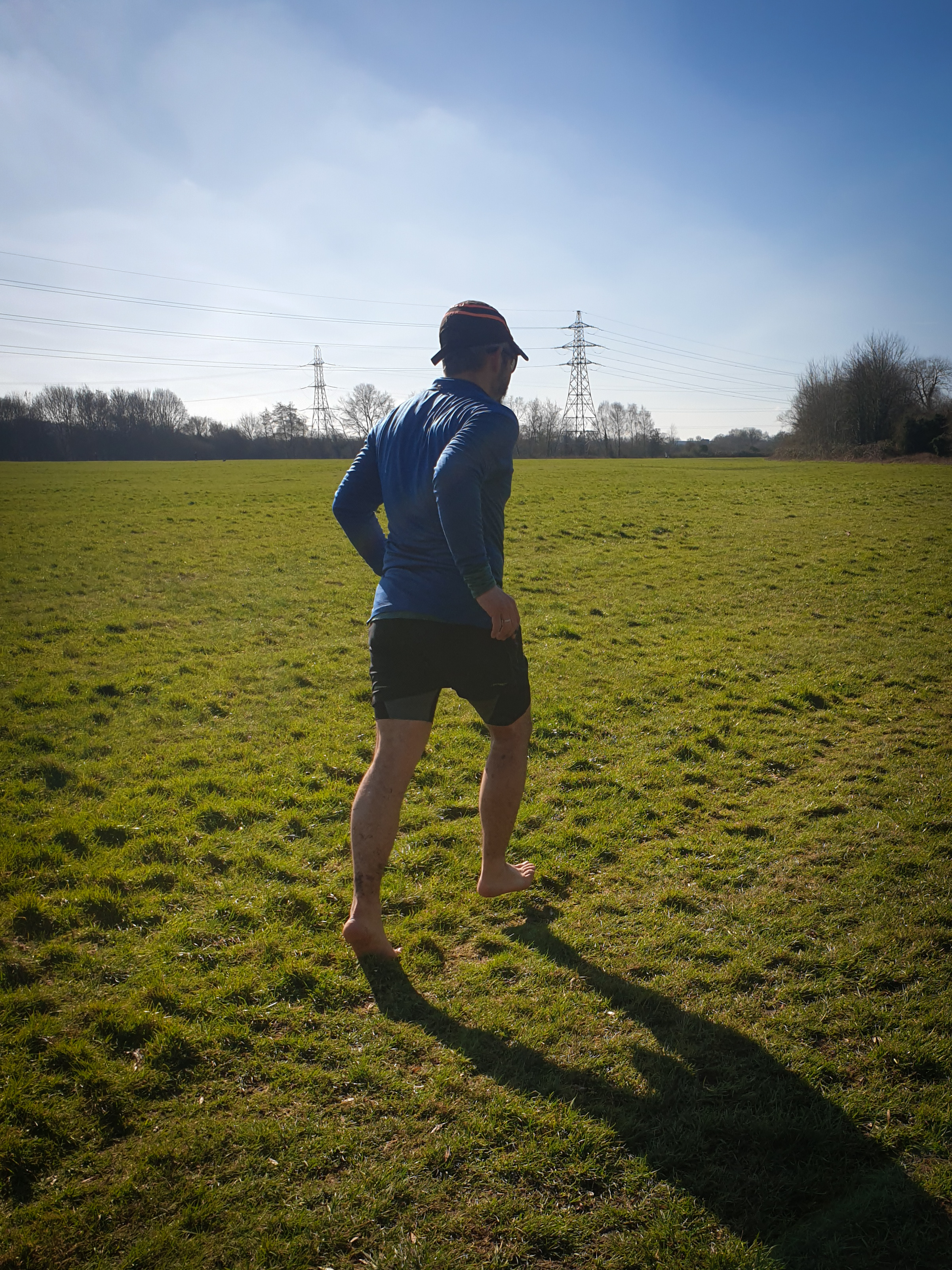 The grass was soft and free of debris, the sun was shining, so I indulged a curiosity and slipped my muddy shoes off to run a few hundred yards barefoot.
